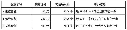 使用神州行充值卡充值联众币的用户在活动期间充值同样有赠送: 神州行50元面值充值卡可充值500联众币,赠送5元当当购物券一张; 神州行100元面值充值卡可充值1000联众币,加赠30联众币+5元当当购物券一张; 神州行300面值充值卡可充值3000联众币,加赠100联众币+5元当当购物券一张; 神州行500元面值充值卡可充值5000联众币,加赠180联众币+5元当当购物券一张。