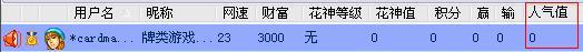 【人气值】 钻石麻将的玩家都有这个值,默认为零,跟游戏豆、游戏盘数等是游戏里的虚拟数据,显示在用户列表中。