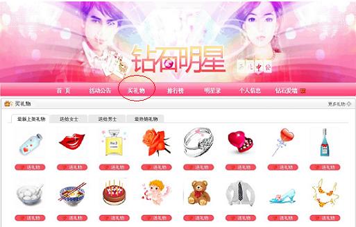 【购买礼物方法】 1、进入钻石明星专题后,点击导航栏上面的“买礼物”,进入买礼物页面,选择心意的礼物。