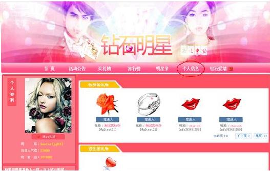 【查看送出和收到的礼物】 进入钻石明星专题后,点击导航栏上面的“个人信息”,可查看自己“收到的礼物”“送出的礼物”“个人荣誉”。