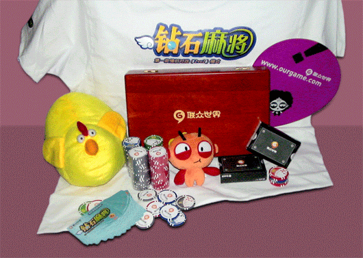 钻石麻将幸运大礼包中包括:联众筹码礼盒、钻石麻将T恤衫、DOBY公仔、下蛋母鸡公仔、联众逗号造型鼠标点、钻石麻将幸运卡。