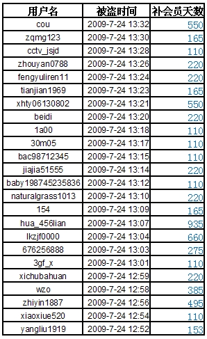 7月24日经用户投诉,我们发现一部分用户的会员资格被他人盗取密码后通过联众公司正在举办的“会员共享”活动被非法转移。现盗取事件己通报相关部门,该非法用户账号被联众公司永久封闭,被盗会员资格已全部追回。我们将为本次事件中丢失会员资格的用户补上相应丢失的会员资格,具体数额如下表。希望以下列表中的用户尽快修改账号密码、二级密码以确保账号安全,同时也请大家注意自己的账号密码安全,经常修改复杂的账号密码、尽量避免在网吧等公共平台上网,以及安装并及时更新防火墙等。