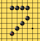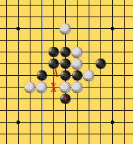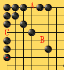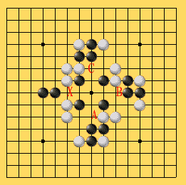 当黑着X位时同时形成二个"三",一个是连续型的"三",它可以通过二端的延伸成为"活四",因此它是真正的"三";另一个是间断型的"三",它要成为"活四"就必须走A位,因此A位必须不是"禁手"点。可是当黑棋着A位时又同时形成三个"先手",一个是将原本的间断型的"三"走成"活四",并形成另的二个"三"。它们也分别是间断型和连续型的二个,其中连续型的"三"可以形成"活四",是"三";而那个间断型"三"的判断又取决于B位是否为"禁手"点:如果B点是"禁手",那么这个间断型的"三"就不是真正的"三",因此A点是"四、三"胜点,可以下子,同时证明X、A之间的间断型的"三"是真正的"三",所以X点是禁手点。但这只是建立在假设B点是"禁手"的基础上,要着实判断X点的问题必须判断B点。同理,判断B点又必须再判断C位,从图上看C点仅形成一个真正的"三",并使从B到C的"三"成为"活四",因此C不是"禁手"。且慢,我们的判断是从定义出发,首先,X的是否为"禁手"要判断一子下去同时形成几个"先手",先前已证明那个连续型的"三"是真正的"三",现只要判断这个间断型的"三",而判断的同时又需判断其它的"禁手"问题,但请注意:虽然在判断X点时,X点上没有子,然而当判断X与A之间的"三"的时候,必须假设X点上已经下了一枚黑子,只有这样才有可能进行正确的判断。因为在判断中,X点是否有子,有可能影响到判断的结果,我们仅仅判断这个间断型的"三"是否能下成"活四",而不是其它的。在此因为在判断C点的同时,由于想到了X点上有子,因此C是"禁手"点,因为它是"四、三、三"点,从而证明从C到B的间断型的"三"是假的(因为它无法走C位使之成为"活四"),即B点可以下子(不是"禁手"点),从而说明A点是"禁手"("四、三、三"),从而可见X、A之间的"三"不是真正的,因此,黑棋走X位只形成一个"三",不是禁手。