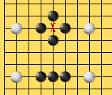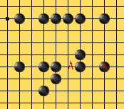 X这一点有可能被看作是三三。但是,由于竖跳三的下一手在A点将成四四禁手而不能走,这种竖三属于死三,所以X点不算三三