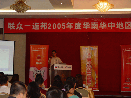 (本站讯)2005年7月9日,北京联众电脑技术有限责任公司和北京连邦软件股份有限公司在广州天河区总统大酒店召开了“联众-连邦2005年度华南、华中地区经销商大会”。本次会议是北京联众电脑技术有限责任公司和北京连邦软件股份有限公司2005年度新版联众实物卡推广活动的最后一站。