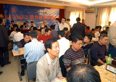 图为北京市职工强力家具杯象棋赛比赛现场。