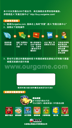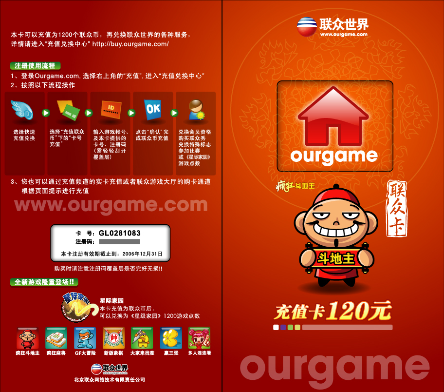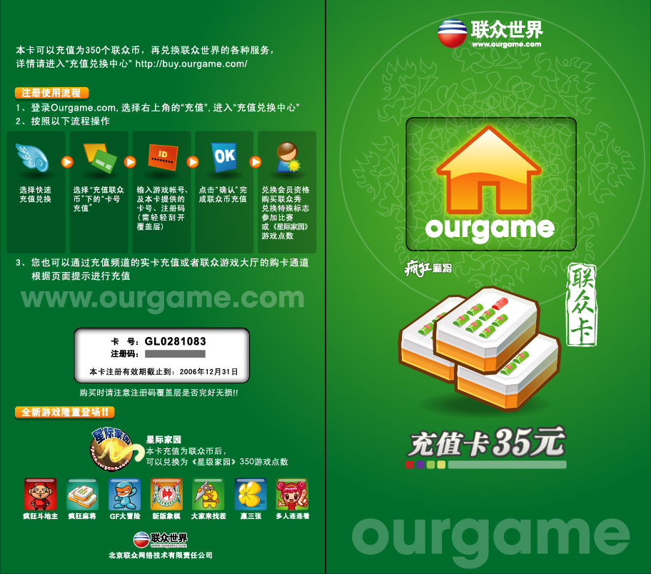 35元充值卡卡套正面 35元充值卡卡套反面 新卡产品预计上市时间为12月6日前后,首批发行产品数量有限,有意订购以上产品的经销商朋友请与联众公司渠道合作部联系,咨询详细信息。