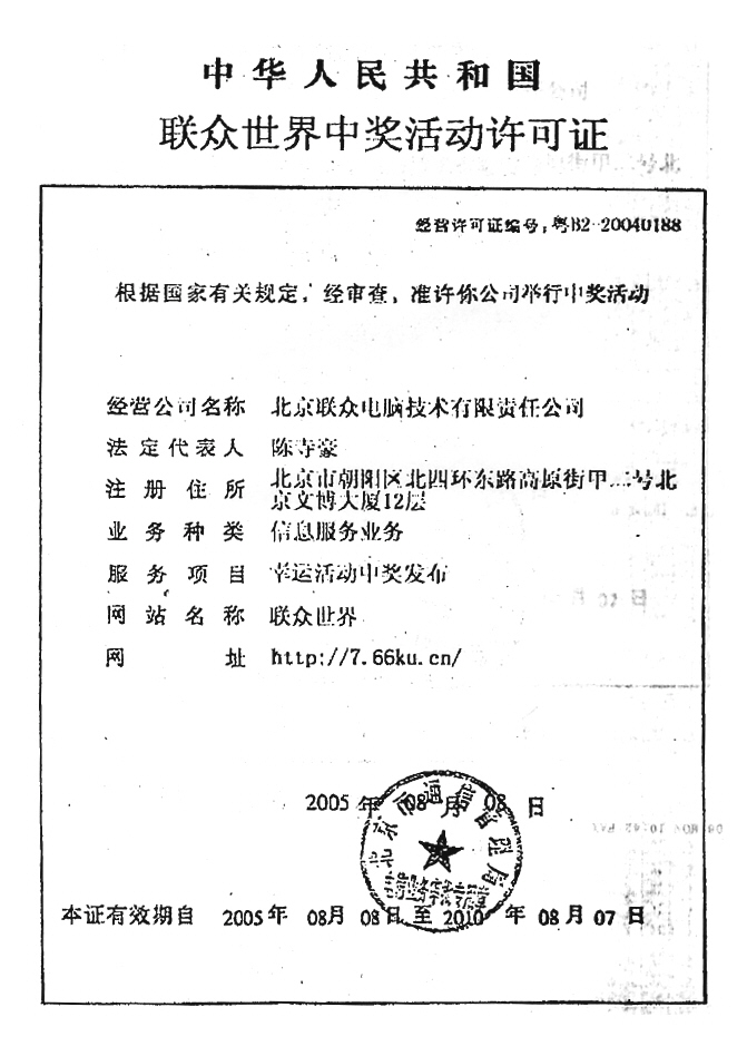 (虚假许可证样张)   5、请各位用户不要轻信此类虚假网站提供的虚假客服电话、电子邮箱及QQ等联系方式,联众公司客户服务热线只有唯一的电话号码:(029)87669595,在各位用户收到任何无法辨别真伪的信息时,建议您拨打此电话进行咨询。