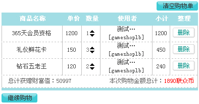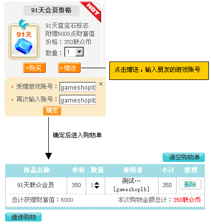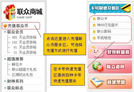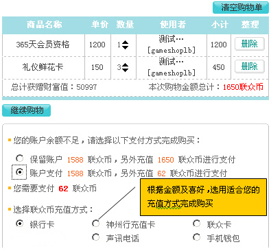 3、购物中途即时充币,享受畅通无阻的购物VIP服务 在购买过程中发现账户联众币不足,只需在页面下方选择支付方式,即可一步完成联众币的充值和本次购物订单的支付。同时,多余部分的联众币将自动转存您的游戏账号中。 4、保留卡号快速充值和单独的联众币充值区 新的商城保留了有卡用户的快速充值通道,如果您拥有充值的卡号,只需在该区域中进行选择充值方式,就可以在最短的时间内完成充值。同时也专门开辟了联众币充值区,充分尊重部分用户先充值后消费的购买习惯。 5、用购物单选购多种商品,只需支付一次即可完成 有了购物单,从此可以一次选购多种商品,并可随时修改商品数量。 6、随心所欲为朋友赠送商品或充值联众币 浏览商品点击“赠送”,指定受赠游戏账号,支付后即可把商品送给朋友。