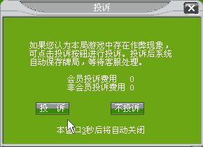 1、在每一盘游戏即将结束、显示得分对话框时,会自动弹出投诉、不投诉按钮,当农民认为另一位农民与地主有合伙作弊行为时,请点击投诉按钮。 当局地主得到如下提示。