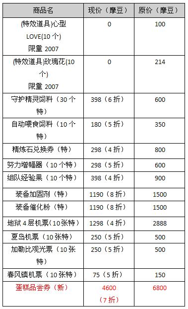 五一期间超豪华内置商城特卖,满足玩家们的一切需求! 1、免费送:内置商城“天上掉馅饼”,免费送特效道具; 2、打折类:自动喂食饲料、夏岛机票、加勒比观光票、春风镇机票的新鲜上架打折; 3、新品类:蛋糕品尝券(新),经过升级的蛋糕品尝券可以选择接三种不同任务,除了增加额外3个属性点每个角色只能接一次外,其他两个任务均可反复接(1、等同于假期欢乐杂志的效果;2、加3000荣誉及9999名望。) 4、极品类:70BOSS装升75死神装的各职业道具,适合拥有70BOSS装,希望升级至75BOSS死神套装的玩家享用,穿齐死神套装后激发“死神降临”,“每天18:00—次日凌晨6:00角色死亡后不掉经验”。