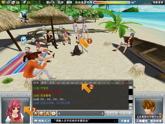 对重点怀疑对象做实时跟踪观察,被选择的玩家角色和线索信息,将显示在屏幕的右下角,玩家可以根据喜好选择以下方法: 1、右键单击图形区域中的玩家人物“箭头1”,屏幕右下角的线索监视框内显示这个玩家形象,并提示这个玩家的当前状态,比如思考、输入信息等,再次点击右键则会取消选择; 2、右键点击聊天区域上方的数字标签“箭头2”,再次点击右键则会取消选择; 3、在当前发言人框内,右键点击人物角色“箭头3”,再次点击右键则会取消选择。