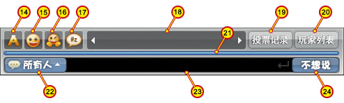 其中,查看一个或多个角色聊天记录,也就是只看固定某个或某几个玩家的聊天记录,方法有以下几种,玩家可以根据喜好任选一种: 1、鼠标左键单击图形区域中的玩家人物“箭头1”,并且支持多选,再次点击则会取消选择(杀人、验人、投票的过程中,鼠标左键只有选择人物的功能,不会显示该玩家聊天记录); 2、左键点击聊天区域上方的数字标签“箭头2”,并且支持多选,再次点击则会取消选择; 3、在当前发言人框内左键单击显示的人物角色“箭头3”,可以查看该玩家的聊天记录; 4、在线索监视框内左键单击显示的人物角色“箭头4”,可以查看该玩家的聊天记录。