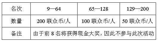 2、复赛结束排名9—200名的选手奖励联众币,具体数量: