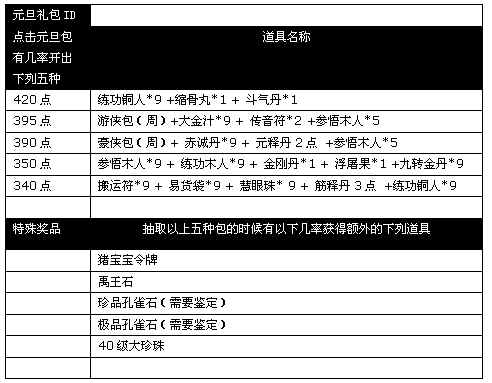 促销形式:玩家购买300点的元旦礼包,除获得340-420点的道具组合外,还有机会抽到特殊奖品,包括禹王石,孔雀石和永久性的猪宝宝令牌。