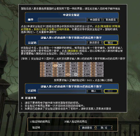 当玩家输入玩密码后,就会进入到服务器选择页面。在这个页面的左侧会出现安全验证卡。玩家可千万不要小看了安全验证卡的作用,很多玩家认为填写安全验证卡是件麻烦的事情,会直接跳过该页面。现在,就来告诉你,如何简单操作安全验证卡,加强账号安全保护。