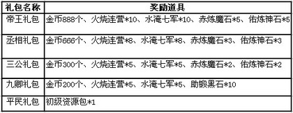 礼包赠送道具简介: 金币:日常消耗道具,可以在商城购买道具,在集市和玩家交易等,通过充值获得。 火烧连营:放火烧营,杀伤攻方部队的士兵,购买后,在点兵场出兵界面的锦囊槽选择使用。 水淹七军:放水淹城,杀伤守方部队的士兵,购买后,在点兵场出兵界面的锦囊槽选择使用。 赤炼魔石:女娲补天遗落的石头,可以代替副炼装备进行装备的合成,也可以升级武将仓库,有 一定的成功率。 佑炼神石:用于改良装备,也可以升级官府宝库,购买后,在铁匠铺的装备改良界面消耗使用。 助锻黑石:用于升级装备,购买后,在铁匠铺的装备升级界面消耗使用。 初级资源包:增加三种资源各2000。