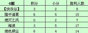G组: 诸葛妙算 顷刻一骑绝尘 G组目前有两大冷门,一个上轮闯进十六强的台服老牌军团绝灭之风两战全败,就算最后两场比赛全胜,出线的几率也非常之低,仅存在理论上的可能。