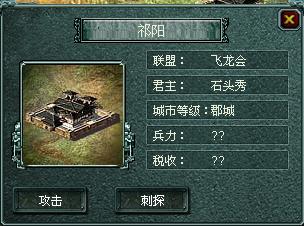 三、“刺探”功能 点击敌对城市弹出城市界面,在界面中点击刺探即可刺探对方城市,刺探信息将发送到邮件内,“刺探”功能的开放,让你从今以后对敌人的行踪了如执掌。
