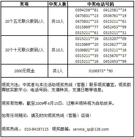 “声讯直充热线116969168 充值豪礼”活动第一轮抽奖已经完成,凡在09年1月1日至2月28日期间,使用 116969168 充值联众币至少一次的用户,由系统自动记录并获得第一轮抽奖资格。