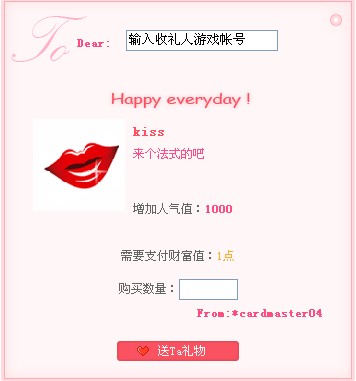 2、点击礼物下方的“送礼物”按钮。 3、进入赠送礼物界面,填写收礼人游戏账号以及购买的数量,点击“送Ta礼物”按钮,待着您浓浓情意的礼物就会马上送到您朋友那里。