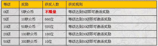 活动说明: 1、活动时间:7月27日服务器开放---2009年8月5日5:00; 2、0级奖励不限量领取:登陆游戏就能获得领取5联众币奖励的资格,只需要花费2分钟等级达到5级即可激活奖励; 3、5级奖励共有666个名额:当您等级达到5级将获得领取10联众币奖励的资格,只需要花费10分钟等级达到10级即可激活奖励; 4、10级奖励共有555个名额:当您等级达到10级将获得领取50联众币奖励的资格,只需要花费30分钟等级达到20级即可激活奖励; 5、20级奖励共有188个名额:当您等级达到20级将获得领取100联众币奖励的资格,当您等级达到30级即可激活奖励; 6、50级奖励共有10个名额:当您等级达到50级将获得领取300联众币奖励的资格,当您等级达到50级即可激活奖励; 7、角色等级相同的情况下,按照角色达到获奖要求的时间排序发放联众币; 8、活动结束后3-5个工作日,将根据统计结果发放联众币,玩家可在《武林英雄》专区或游戏论坛查看获奖名单; 9、所有奖品虚位以待,先到先得,发完为止。