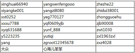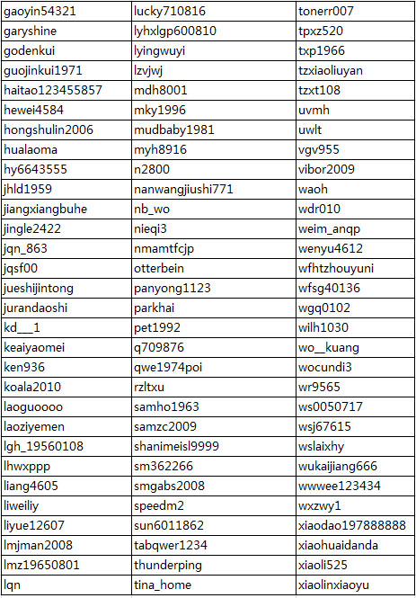 亲爱的联众世界四国军棋用户: 自10月26日“体验新军棋,得4重新生大礼”活动开展以来,受到了广大玩家的热烈支持。 继上期截止到10月28日发布的250名用户后,到10月31日为止,又有201名用户满足条件。他们不仅在新版四国军棋获得了负分清0、断线率清0、盘数记录不变的大礼,更获得了彰显独特身份的“功勋蓝刀”标志3天! 恭喜这些用户!! 第二批“功勋蓝刀”标志已经在11月1日13点20分发放完毕。敬请查收。 获奖用户名单如下:
