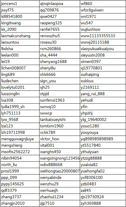 亲爱的联众世界四国军棋用户: 自10月26日“体验新军棋,得4重新生大礼”活动开展以来,受到了广大玩家的热烈支持。 继上两期截止到10月31日发布的456名用户后,到11月3日为止,又有186名用户满足条件。他们不仅在新版四国军棋获得了负分清0、断线率清0、盘数记录不变的大礼,更获得了彰显独特身份的“功勋蓝刀”标志3天! 恭喜这些用户!! 第二批“功勋蓝刀”标志已经在11月4日14点20分发放完毕。敬请查收。 获奖用户名单如下: