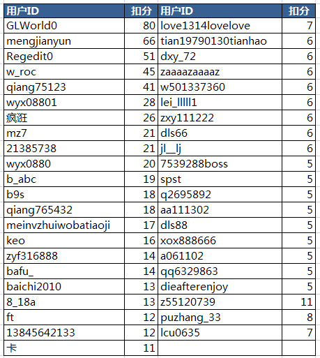 特此公告。祝您游戏愉快! 查询方法:ctrl+f 输入ID查询。 用户ID 扣除盘数 tc7313652 238 gpjw5221945 139 3_wangjing 131 love1314lovelove 110 wyx08801 108 mengjianyun 93 wyx08802 87 GLWorld0 80 aaaa83984331 79 high__brow 69 qiang7654 61 jll 58 Regedit0 51