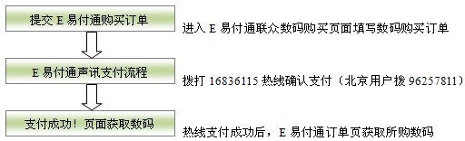 为了向用户提供更加方便快捷的联众充值服务,联众世界与北京盛峰远景(E易付通)公司合作面向全国电信用户开通声讯数码购买热线16836115,并且提供“网页获取数码”的服务,让您不再依靠纸笔记录数码,享受轻松贴心的优质服务。 一、热线基本信息 【热线号码】:16836115 (北京用户请拨打96257811专线) 【服务提供商】:北京盛峰远景(E易付通) 【开通范围】:北京、四川、重庆、上海、西藏、宁夏、广西、新疆、安徽省、甘肃、广东、贵州、海南、湖北、湖南、江苏、江西、青海、陕西、云南、浙江、福建, 22个省市自治区电信固话及小灵通支付用户。 【开通产品】:5元数码、10元数码、20元数码、30元数码 【服务方式】:24小时自动语音服务,网页获取联众数码 【资费标准】:按次收取信息费 【消费限制】:每个主叫的信息费最高限额为300元/月 【客服电话】:400-888-1100(免长途费)010-51657299(不免长途费),7*24小时服务 二、购买流程说明