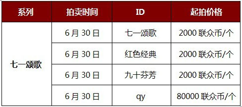 注:如因服务器故障、页面刷新等不可抗因素造成的竞拍无法正常进行,当日竞拍结果视为无效,联众公司有权收回ID,并返还联众币。