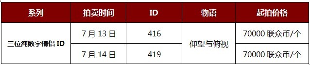 诗意”情侣ID说明: “诗意”情侣ID属于联众经典ID中的一个系列,该组ID包含三位纯数字ID“416”和“419”。起拍价格为单一ID价格,此系列ID为买断ID,附赠一张实物卡,安全有保障。一旦发生争议,以持实物卡为唯一判断归属标准,具有极高的收藏价值。 进入竞拍 实物卡: