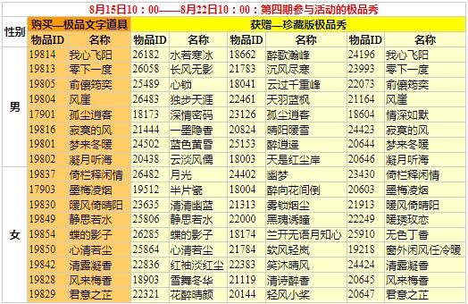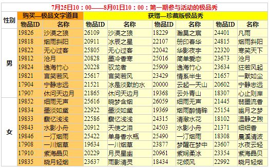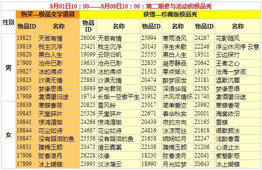 活动时间: 7月25日10:00——8月01日10:00:第一期活动 8月01日10:00——8月08日10:00:第二期活动 8月08日10:00——8月15日10:00:第三期活动 8月15日10:00——8月22日10:00:第四期活动 活动时间以服务器时间为准。 活动内容: 1、各期活动期间:购买极品文字道具,可以获赠指定的三款珍藏版极品秀。 2、极品文字道具价格为1400币/30天,赠送的珍藏版极品秀有效期为5天。 3、每期活动期间,参与当期活动的极品秀翻新价格为50币/5天。 4、每期活动结束后,极品文字道具停售(可翻新),珍藏版极品秀恢复原价。