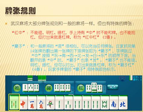 武汉麻将游戏帮助 武汉麻将是以武汉地区流行的红中癞子杠规则为蓝本开发一款极具地方特色的麻将游戏,具有刺激、公平、以小博大的游戏特点,欢迎大家来体验。 武汉麻将的基本玩法: 1、红中、癞子杠