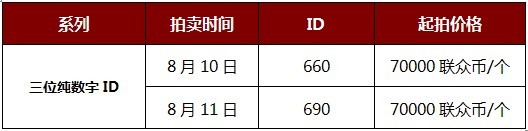 三位纯数字ID说明: 三位纯数字ID属于联众经典ID中的一个系列,起拍价格为单一ID价格,此系列ID为买断ID,附赠一张实物卡,安全有保障。一旦发生争议,以持实物卡为唯一判断归属标准,具有极高的收藏价值。 进入竞拍