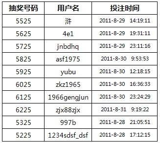 “8月2万联众币”大奖中奖号码: 大奖中奖用户ID:: 所获奖品:20000联众币 该用户一共购买了12个抽奖号码。从5418至5429,购买5425的时间是2011-08-28 23:29:51 附大奖产生依据:9月1日股市收盘上证指数2556.04,深证成数11352.86,本次活动总抽奖号码共产生6238个) 大奖产生计算规则请参见>>活动新闻 “幸运参与奖”十个中奖号码:5525、5625、5725、5825、5925、6025、6125、6225、5425、5325。