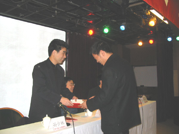 联众副总裁简晶与国手李新 漆有光先生给优胜者颁奖 孙少林大师给优胜者颁奖