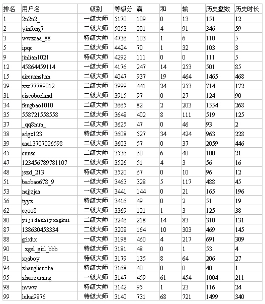 说明: 数据来自“中国象棋排行榜” (生成时间:2003-2-28 8:03 ) 注:排行榜上的数据均为2-3天前的,以下用户清零后,预计要在2-3天后才会自动下榜。