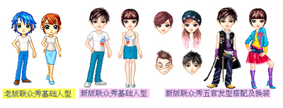 同时,在新形象更换之后,旧款联众秀形象将继续在商城中存在,他们将与新的联众秀形象一起,为您打造更加亮丽的联众网络生活! 下图为新旧形象的对比: