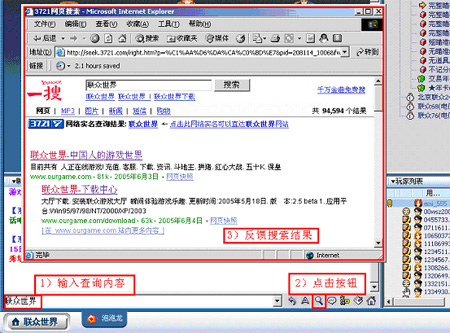 1)增加了3721上网助手,如果用户曾经安装过3721插件,则此次安装不会提示;如果用户选择了取消,则以后也不会再提示。 2)大厅上方的ToolBar区域,增加了“频道”按钮,当用户点击频道的时候,频道将出现下拉菜单,菜单上罗列着频道的内容,当用户点击某频道的时候,大厅右侧页面将响应用户的操作,显示相应的内容。 3)大厅上方的ToolBar区域,增加了“联众秀”按钮,当用户点击此按钮时,将启动大厅内联众秀商城。 4)游戏室聊天区域增加了搜索网络的功能按钮,当用户在聊天区域输入文字,然后点击按钮,即可查询自己想要的互联网内容。 5)在游戏客户端,也可以进行互联网的搜索。 6)修改服务器分组后网管室无法进入正确的服务器的问题。