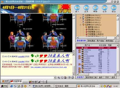 3.用户列表:用户列表中显示了用户的用户名、中文名、网速、财富、断线率、胜率、赢、和、输、桌号、门派、职务、积分等各种信息。用户列表下方标着"所有用户"、"朋友和门派"、"高手"、"平手"、"低手"等文字的书签是用户的类别。如果这些书签中有的您看不见,那么您只要点击这些书签右边的左右方向键,就可以看到了。