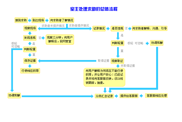 1. 骂人、刷屏:室主到现场后,首先,要找到求助者,向求助者了解骂人者ID、事情经过(如:***您好,请问您投诉哪个ID?能告诉我事情经过么?),根据投诉者提供的信息判断被投诉者是否违规、违规情节是否严重,并且在场观察3分钟。