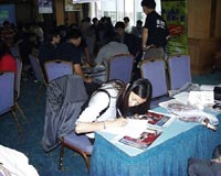 现场的有奖问答在比赛过程中穿插进行,当现场主持人刚刚宣布有奖问答活动开始,就有几十位联众用户挤到了台前踊跃要求回答问题,主持人用幽默风趣的语言使现场气氛变得越发的活跃与轻松,使现场用户通过有奖问答对联众会员权益及联众公司的会员产品有了很深入的了解。其中不少玩家在回答完问题后,当即表示要加入到联众会员的行列中来。